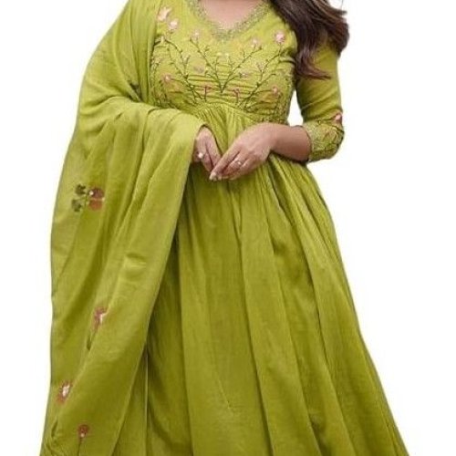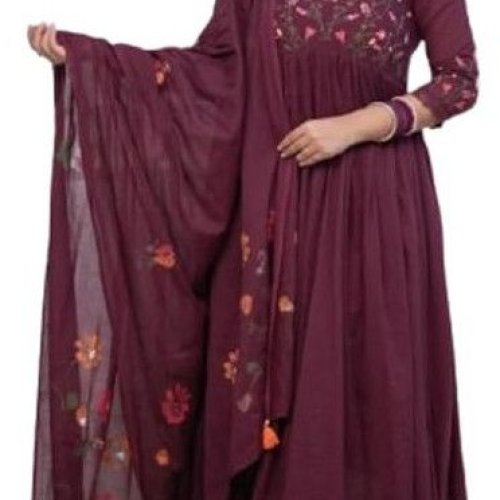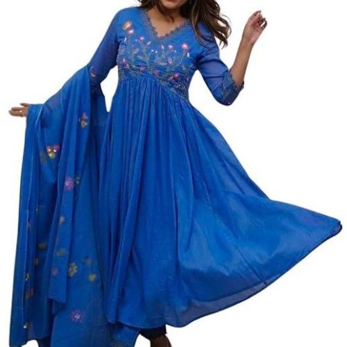 Women's Cotton Embroidered Long Anarkali Kurti with Pant and Dupatta Set